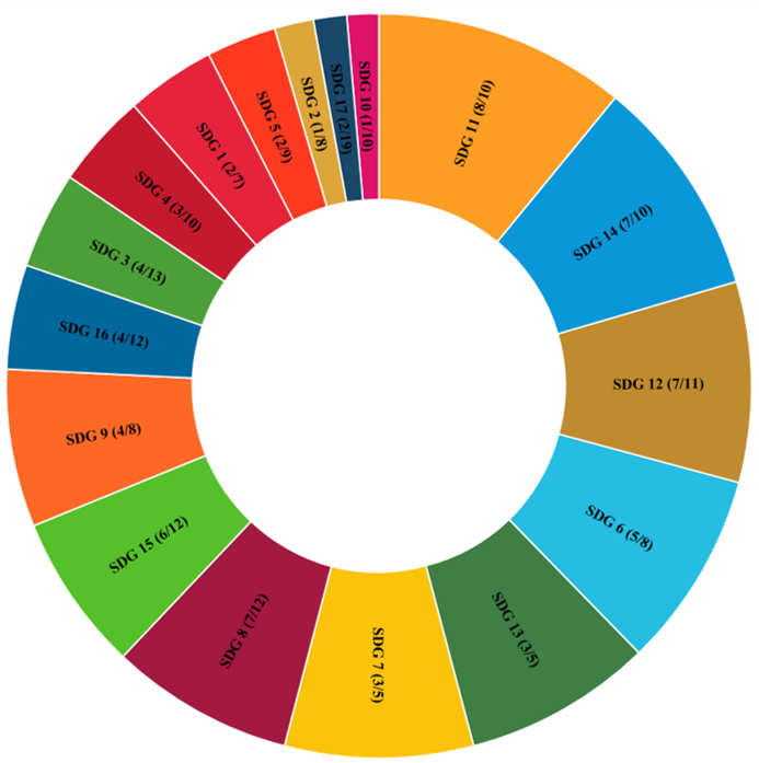 The SDGs with the higher proportion of relevant targets were SDG #14 (Life Below Water at 70%), SDG #12 (Responsible Consumption and Production – 64%) and SDG #13 (Climate Action – 60%).