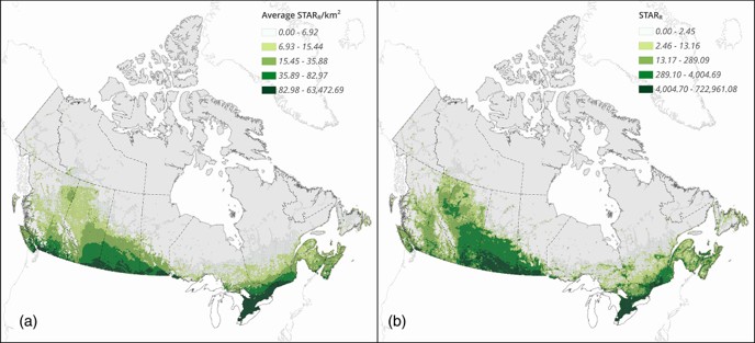 Prioritizing ecological restoration of converted lands in Canada by spatially integrating organic carbon storage and biodiversity benefits. (a) Average and (b) total potential biodiversity benefits of restoring converted lands in Canada.