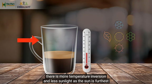 The port has posted videos that explain atmospheric science terms in straightforward relatable ways in English and Spanish. For example, cups with varying levels of coffee are one of the ways the port explains an inversion layer, which occurs when warmer air sits above cooler, denser air and forms a kind of lid that concentrates air emissions for a while.